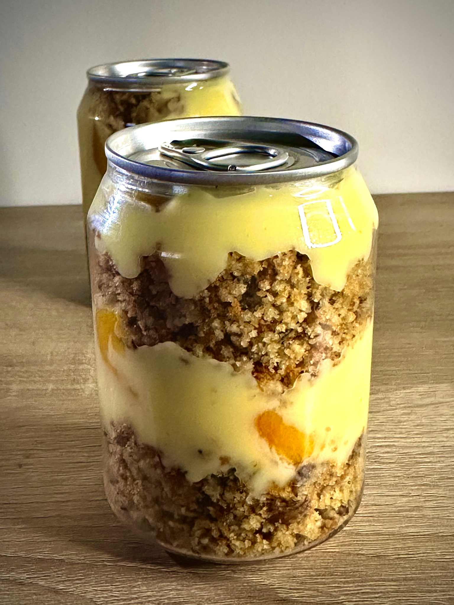 Enjoy a classic banana cake foundation topped with a smooth custard and fresh peach slices, creating a delightful blend of flavors that’s sure to please.